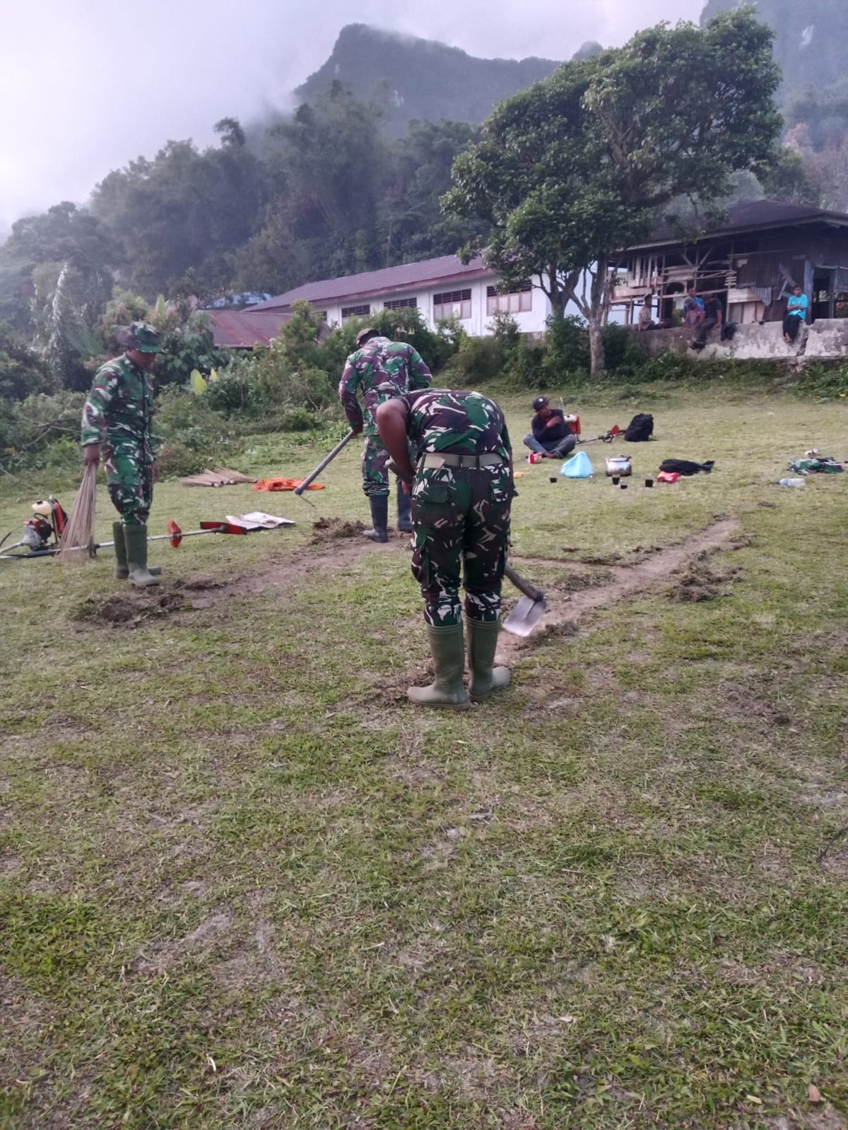 Selain menyiapkan helipad, personel TNI juga melakukan pengecekan kondisi lingkungan sekitar lokasi.