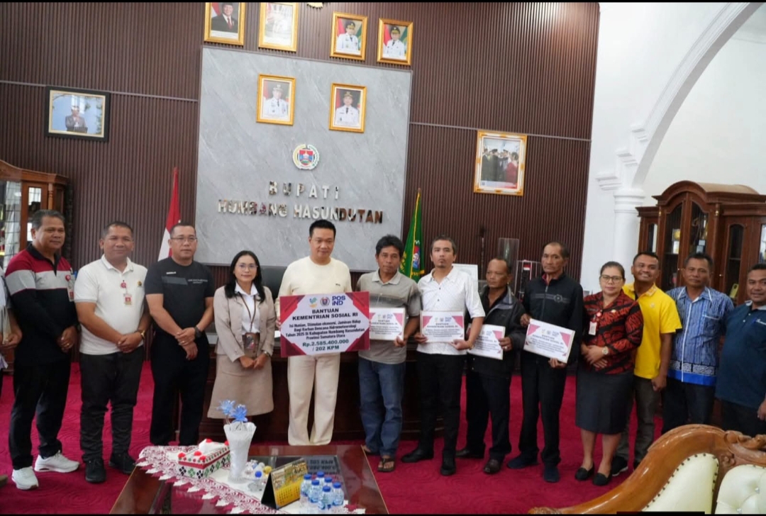 Penyerahan bantuan tersebut berlangsung di Ruang Kerja Bupati, Perkantoran Bukit Inspirasi Doloksanggul, sebagai bentuk respons pemerintah terhadap dampak bencana hidrometeorologi yang melanda sejumlah wilayah.