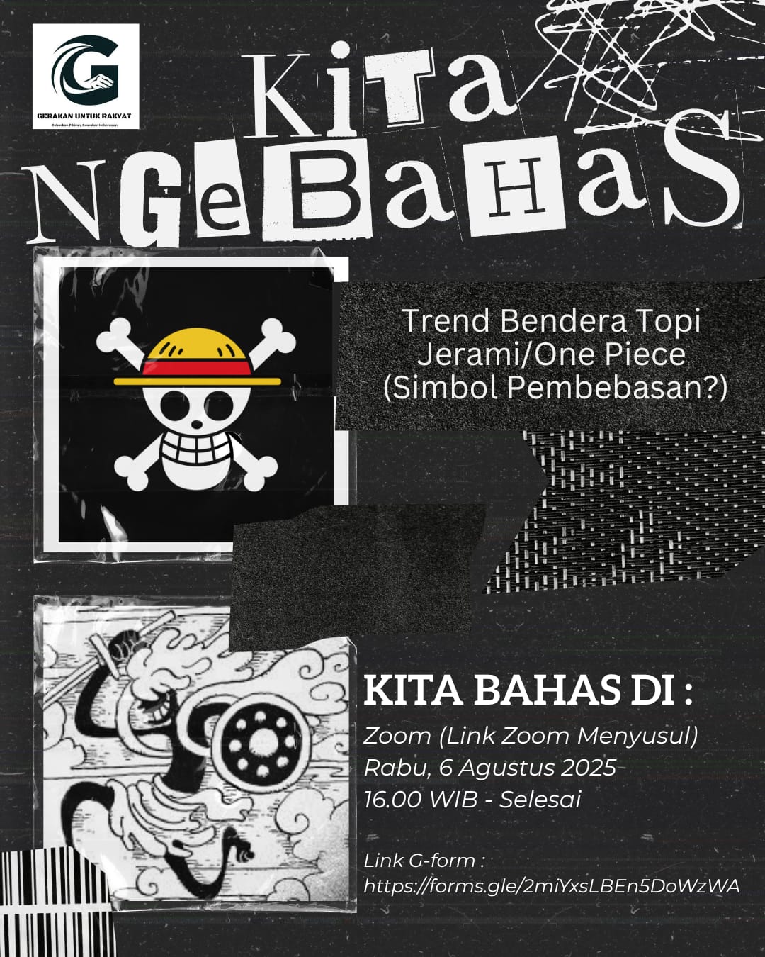 Medan, Instrumentasi.com – GUNTUR (Gerakan Untuk Rakyat) mengadakan diskusi online melalui aplikasi zoom dengan topik “Fenomena Bendera Onepiece yang Marak Menjelang Hari Kemerdekaan”. Diskusi di ikuti oleh puluhan pemuda dan mahasiswa terkhusus di kota Medan, Rabu (6/8/2025).