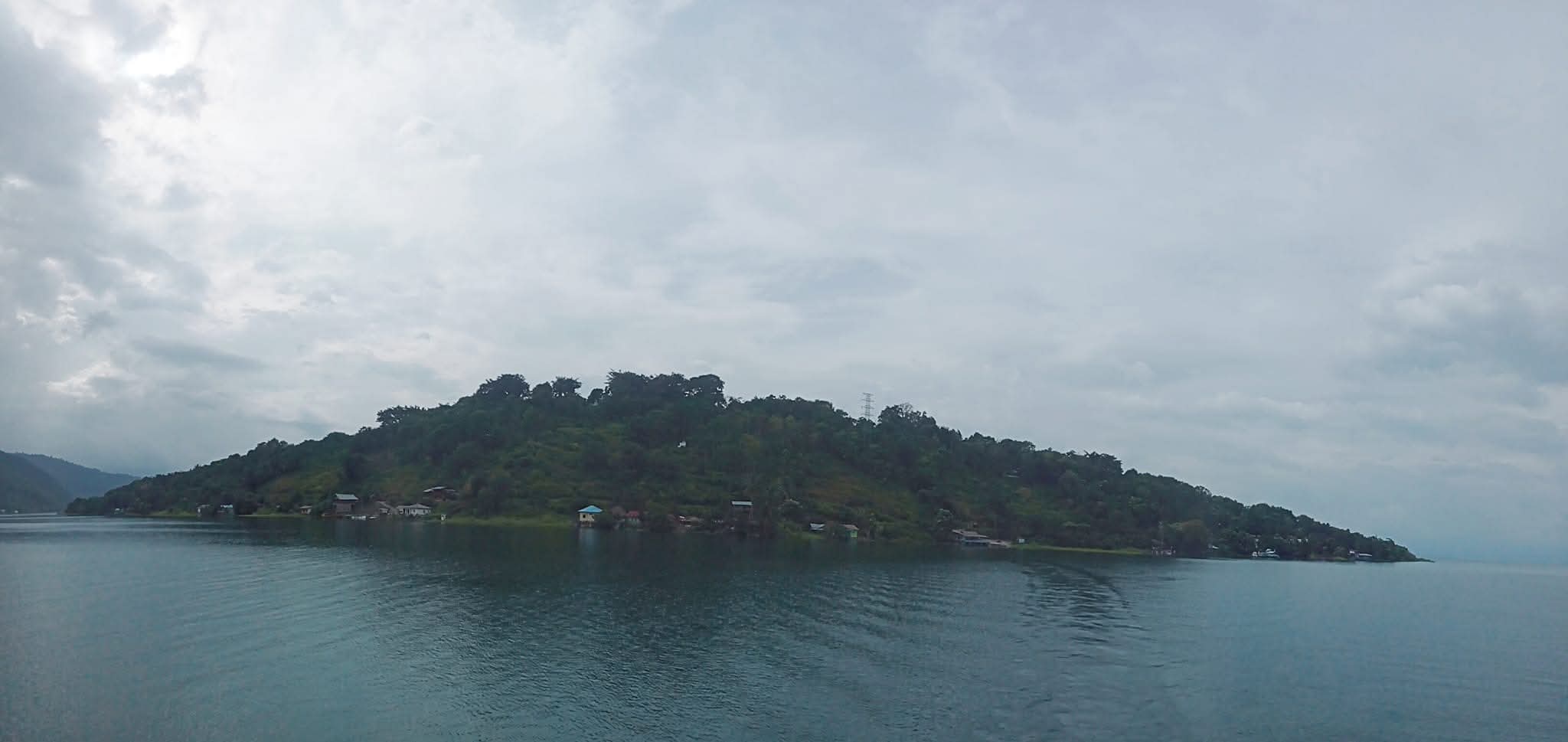 Dari kejauhan, Pulau Sibandang tampak seperti lukisan alam yang utuh. Perbukitan hijau membingkai pulau, berpadu dengan birunya air danau yang jernih dan memantulkan cahaya langit.