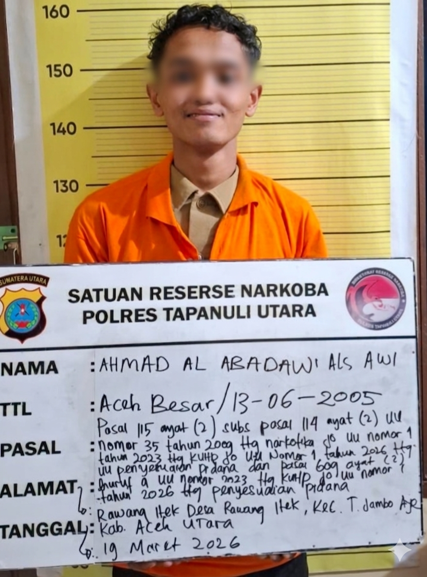 Petugas kepolisian menangkap AAA (21), warga Aceh Utara, saat hendak check-in di Bandara Silangit, pada Kamis (19/3/2026) sekitar pukul 12.30 WIB.