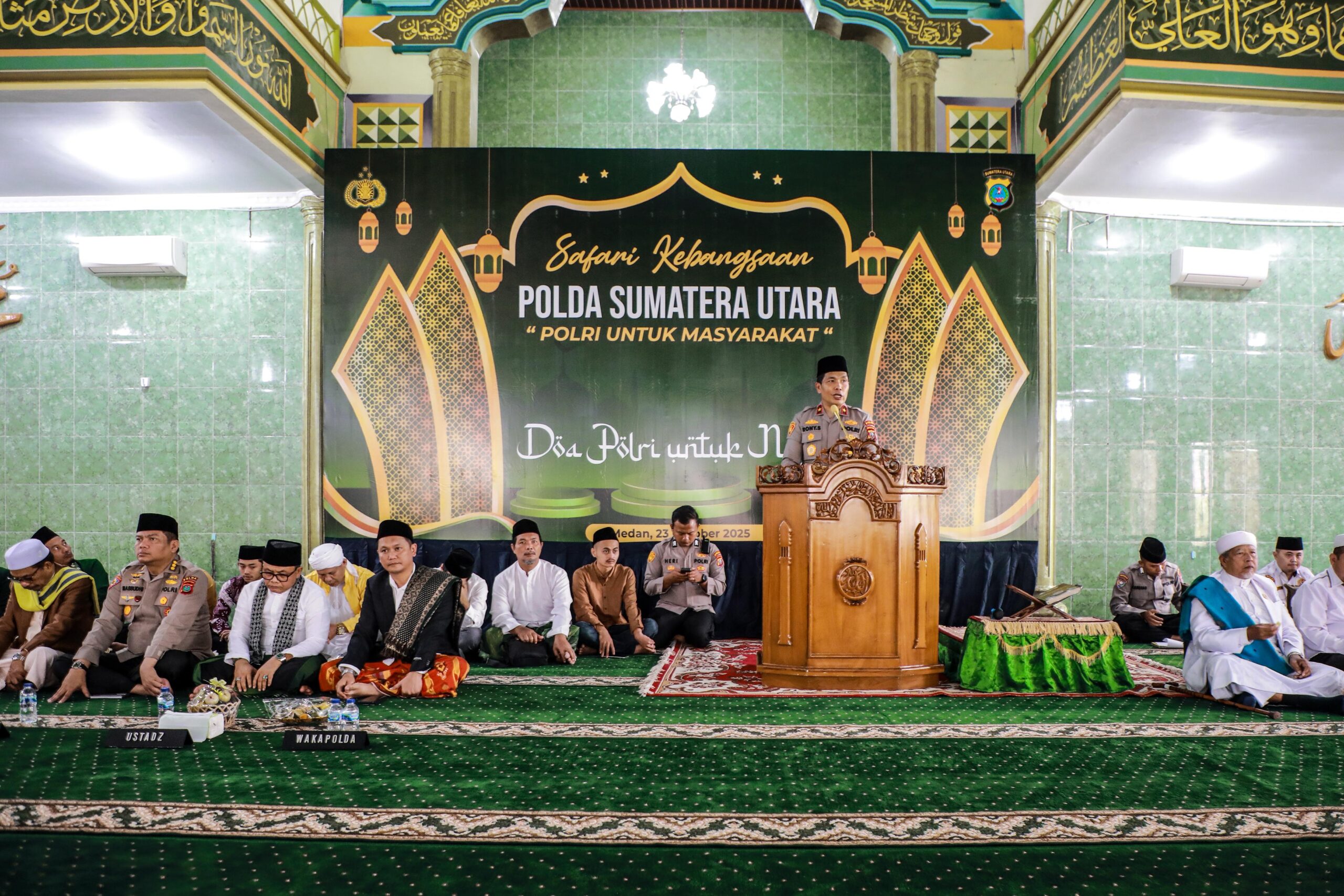 Medan, Instrumentasi.com — Wakapolda Sumatera Utara, Brigjen Pol. Rony Samtana Tarigan, S.I.K., M.T.C.P., mewakili Kapolda Sumut Irjen Pol. Whisnu Hermawan Februanto, S.I.K., M.H., menghadiri kegiatan Safari Kebangsaan Polda Sumut yang digelar di Masjid Al-Hidayah Polda Sumut pada Kamis (23/10/2025).